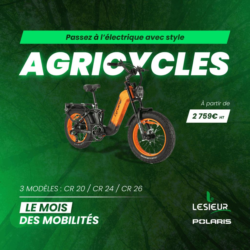 Les vélos électriques Agricycles (CR20, CR24, CR26) sont conçus pour un usage quotidien en milieu agricole. Avec des moteurs puissants (jusqu’à 750W), des batteries longue autonomie (jusqu’à 52V 20Ah) et des pneus adaptés, ils assurent confort et fiabilité sur tous types de terrains. Disponibles en versions homologuées 25 km/h ou 45 km/h pour terrain privé, ils supportent jusqu’à 150 kg et sont idéaux pour les exploitations agricoles.