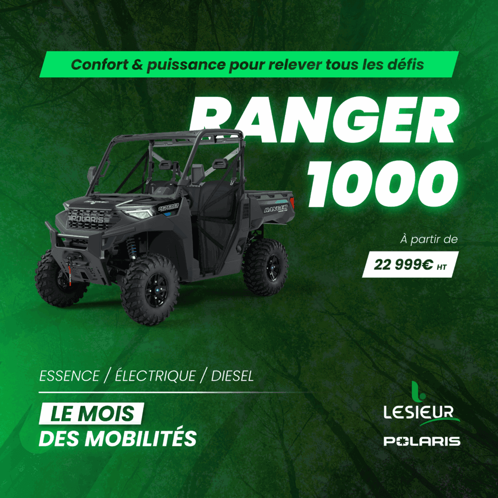 Le Polaris Ranger 1000 EPS combine un moteur bicylindre 999 cc, une capacité de traction de 1 136 kg, un plateau (benne) pouvant charger 454 kg, une garde au sol de 30,5 cm, des pneus de 26″ et une direction assistée électronique. Puissant, fiable et prêt à affronter les terrains difficiles tout en portant vos charges lourdes au quotidien. AUSSI disponible en version DIESEL ou ÉLECTRIQUE
